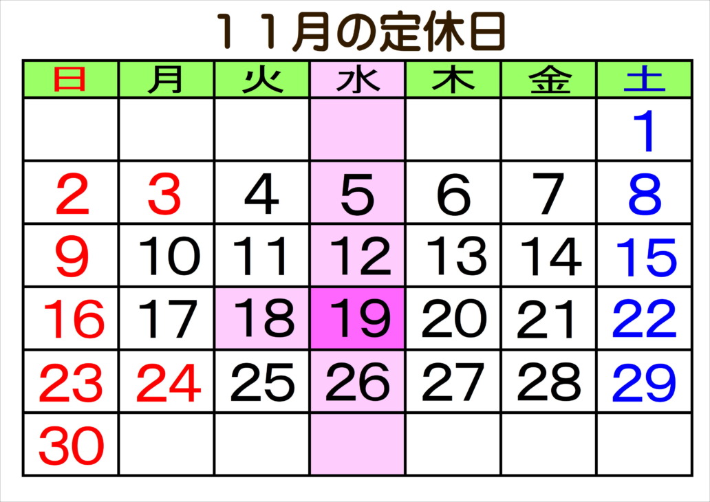 プティレーヴ本店11月のお休みのおしらせです。19日はアピタ松任店もお休みとなります。
